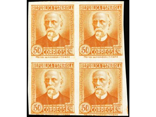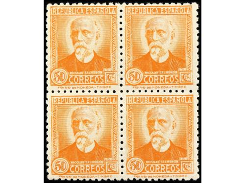 ** ESPAÑA. Ed. 671 (4). 50 cts. naranja. Bloque de 4. Valor clave. RARO y de LUJO. Cat. +360€.