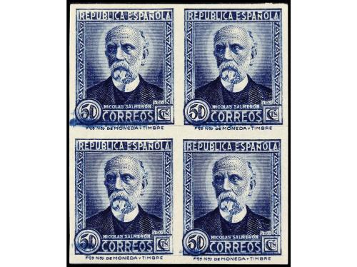 ** ESPAÑA. Ed. 688s (4). 50 cts. azul. Bloque de cuatro SIN DENTAR. Valor clave. RARO y de LUJO. Cat. 1.760€.