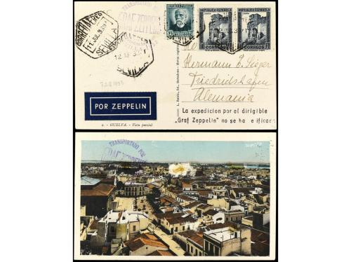 ESPAÑA. Ed. 665 + 673 (2). 1933. Tarjeta postal. SEVILLA a ALEMANIA. 15 cts. + 1 pta. (2). Marcas GRAF ZEPPELIN pese a no haber circulado por este medio. Marca "La expedición por el dirigible "Graf Zeppelin" no se ha verificado". RARA.