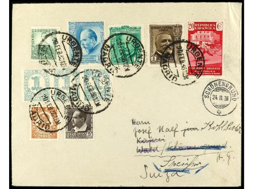 ESPAÑA. Ed. 697/99, 710, 677 (3), 678, 681/82. 1946. MADRID a SUIZA. Precioso franqueo incluyendo el sello de 20 cts. urgente, mat. URGENTE /MADRID. Rara combinación de franqueo, llegada al anverso.