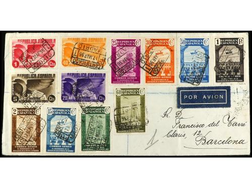 ESPAÑA. Ed. 711/22. 1936. MADRID a BARCELONA. Circulada por Correo Aéreo, al dorso llegada. Precioso franqueo.
