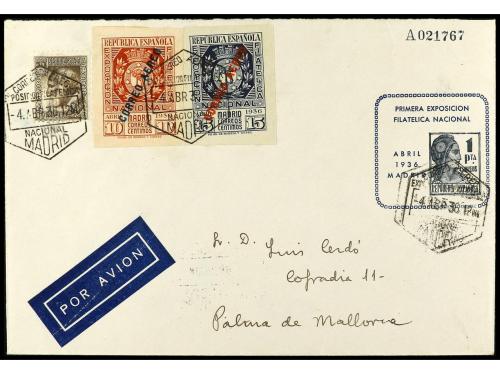 ESPAÑA. Ed. 729/30, 680. 1936. MADRID a PALMA. Entero postal de 1 pta. gris con franqueo adicional de los sellos de Correo Aéreo y sello de 30 cts. falta una solapa del dorso, llegada.