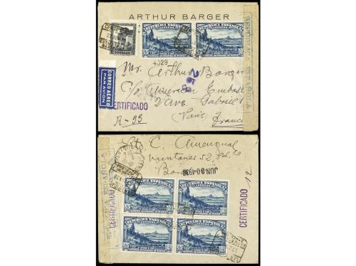ESPAÑA. Ed. 757 (6). 1938. BARCELONA a FRANCIA. 45 cts. + 2 pts. azul dos en el frente y cuatro al dorso. PRECIOSA, al dorso llegada.