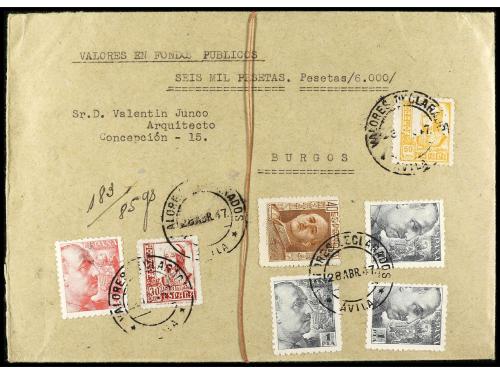 ESPAÑA. Ed. 933, 930 (3), 953, 823, 826. 1947. SEVILLA a BURGOS. Sobre de VALORES DECLARADOS de 6.000 pts. con franqueo de 30 cts., 40 cts, 60 cts. (3), 1 pta. (3) y 4 pts.