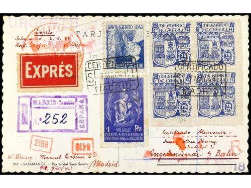 ESPAÑA. Ed. 964, 976 (4). 1944. MADRID a ALEMANIA. Espectacular franqueo incluyendo un sello de Beneficencia. Preciosa combinación de franqueo.