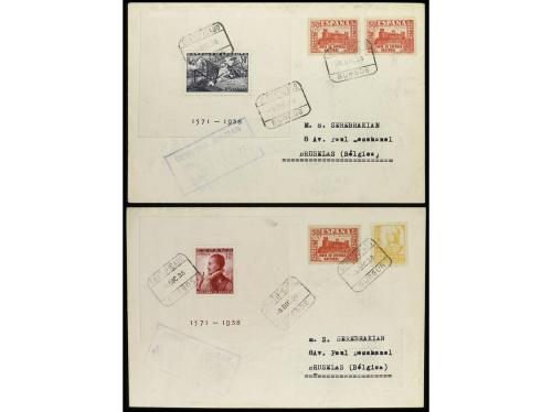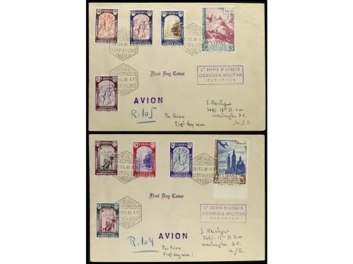 ESPAÑA. Ed. 904/13. 1940 (29 febrero). ZARAGOZA a U.S.A. Serie completa en dos cartas circuladas. Al dorso tránsito y llegada. RARAS. Cert. GRAUS.