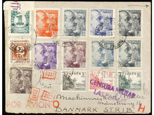 ESPAÑA. 1940. PUERTO DE LA LUZ (Canarias) a DINAMARCA. Espectacular franqueo con sellos del Cid, cifras y Franco con y sin pie de imprenta. Al dorso sellos de La Cierva y José Antonio, tránsito en Madrid y censura alemana.