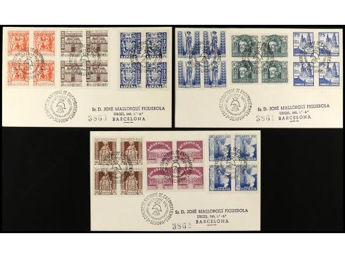 ESPAÑA. Ed. 961/69. 1952 (18 octubre). SERIE COMPLETA en bloques de cuatro en 3 sobres con mat. conmemorativos I CONGRESO NACIONAL DE EXCOMBATIENTES-SEGOVIA.