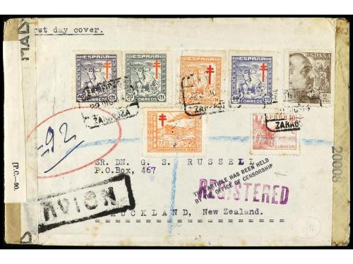 ESPAÑA. Ed. 984/8. 1944 (22 diciembre). Certificado de ZARAGOZA a NUEVA ZELANDA circulado con SERIE COMPLETA y valores complementarios, mat. PRIMER DÍA DE EMISIÓN. Al dorso tránsitos en N. YORK, HONOLULU y otros. RARA.