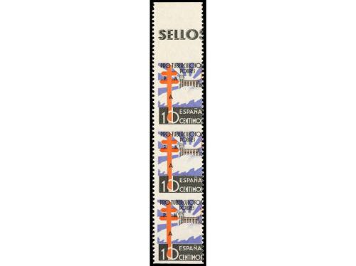 ** ESPAÑA. Ed. 866sh (3). 10 cts. negro, azul y rojo. Tira de tres vertical SIN DENTADO HORIZONTAL y COLOR ROJO DESPLAZADO. RARO. Cat. +81€.