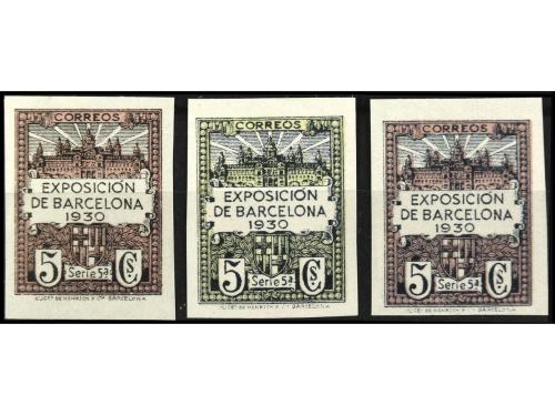 (*) ESPAÑA: AYUNTAMIENTO DE BARCELONA. Ed. 5Eb, 5Ef, 5Eh. 5 cts. tres sellos CAMBIOS DE COLOR, raros sin dentar.