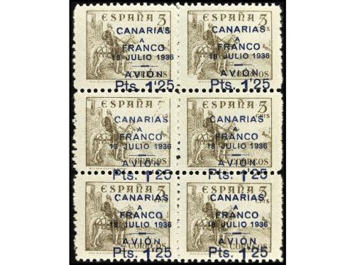 ** ESPAÑA: CANARIAS. Ed. 13. 5 cts. sepia. Bloque de seis, un sello "5" de valor borrado y habilitación DESPLAZADA HACIA ABAJO y sellos centrales sin la impresión del valor. Rara variedad combinada.