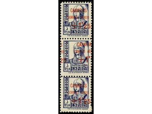 **/* ESPAÑA: CANARIAS. Ed. 30. 1,25 s. 1 pta. azul. Tira de tres vertical, sello central HABILITACIÓN DESPLAZADA quedando la cifra "25" a la izquierda y "+1" a la derecha. RARÍSIMO y no reseñado. Sólo existen 10 ejemplares.