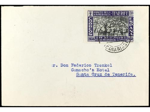 ESPAÑA: CANARIAS. Ed. 54. 1939 (5 enero). LAS PALMAS a STA. CRUZ DE TENERIFE. 50 cts. azul y negro este sello no tenía valor de franqueo pero esta carta está circulada, al dorso llegada.