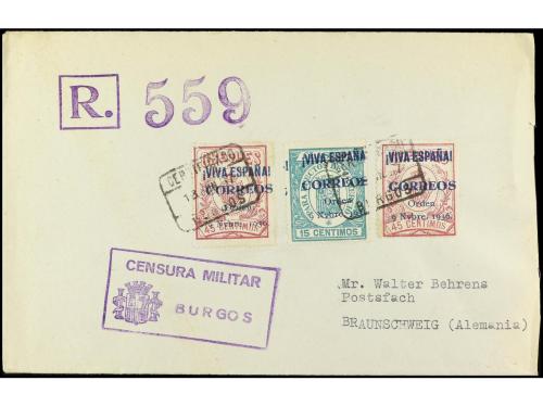 ESPAÑA E. LOCALES PATRIOTICAS: BURGOS. Ed. 29 (2), 32. 1937. BURGOS a ALEMANIA. 15 cts. verde y 45 cts. lila (2) carta certificada sin llegada.