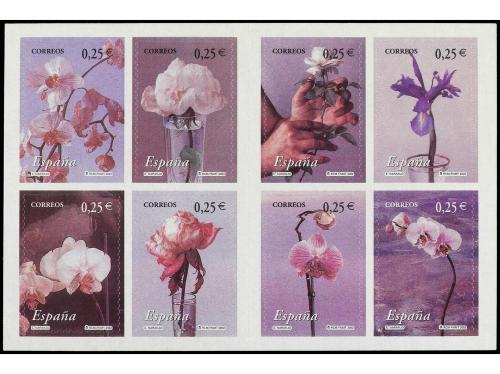 ESPAÑA. Ed. 3869C. LA FLOR Y EL PAISAJE. Hoja de 8 sellos autoadhesivos procedente de carnet. COLOR ROJO ALTERADO, sobre saturación de este color.
