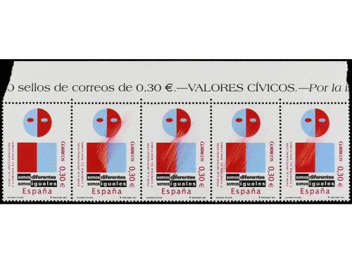 ** ESPAÑA. Ed. 4333. VALORES CÍVICOS. 0,30Ђ rojo, azul y negro. Tira de cinco, en cuatro de los sellos rayas en color rojo diagonales.