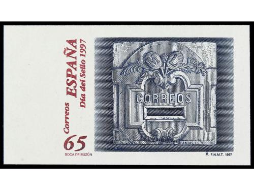 ** ESPAÑA. Ed. 3471s. DIA DEL SELLO 1997. 65 pts. granate y azul oscuro. SIN DENTAR. RARÍSIMO. Cert. COMEX.