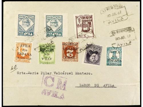 ESPAÑA E. LOCALES PATRIOTICAS: AVILA. Ed. 1/5. 1937. Certificado de ÁVILA a BARCO DE ÁVILA circulado con serie completa y sellos benéficos. Marca de censura en violeta y llegada al dorso.