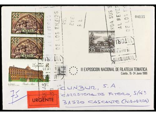 ESPAÑA: PRUEBAS OFICIALES FNMT. Ed. P.O. 9. 1990. Certificado VITORIA a CASCANTE (Navarra), circulado con la prueba de Calella más franqueo complementario. RARO.