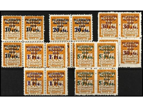 ** ESPAÑA: AYUNTAMIENTO DE BARCELONA. Ed. 4/8 (4). TELÉGRAFOS. Serie completa. 5 valores en bloques de cuatro. Cat. 892€.