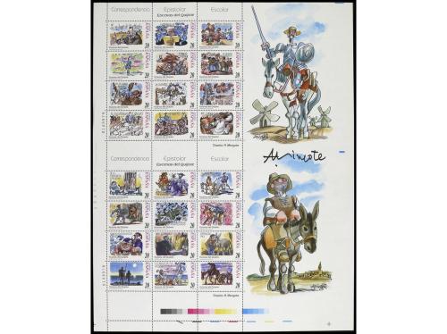 ** ESPAÑA. Ed. 3560/83. ESCENAS DEL QUIJOTE. Los dos minipliegos en pareja vertical sin cortar. Firma autógrafa del dibujante MINGOTE.