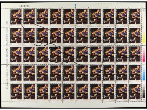 ** ESPAÑA. Ed. 3686. NAVIDAD'99. Hoja de 50 sellos con la firma autógrafa de la pintora ISABEL GUERRA.