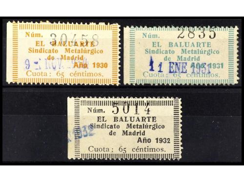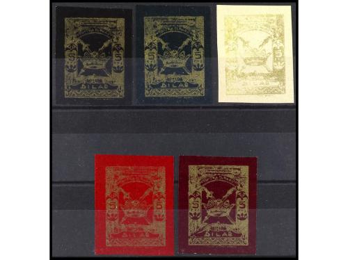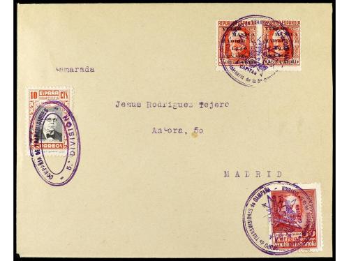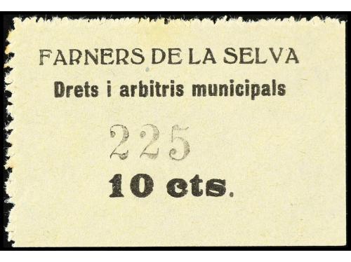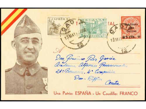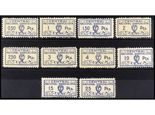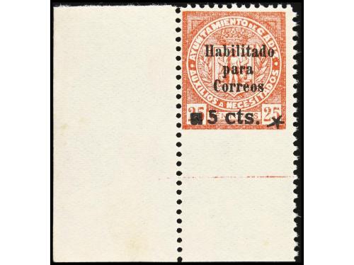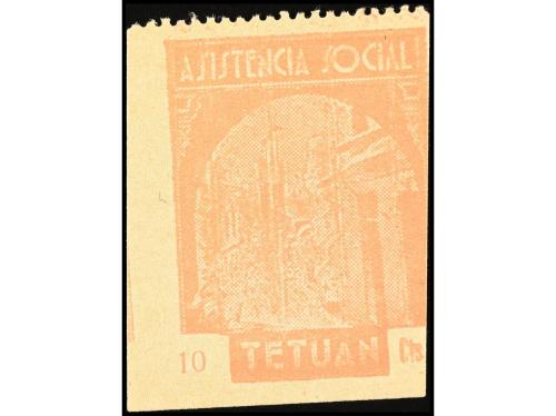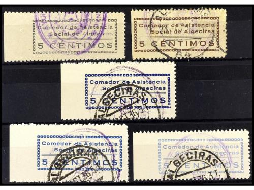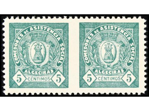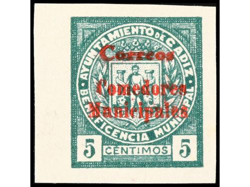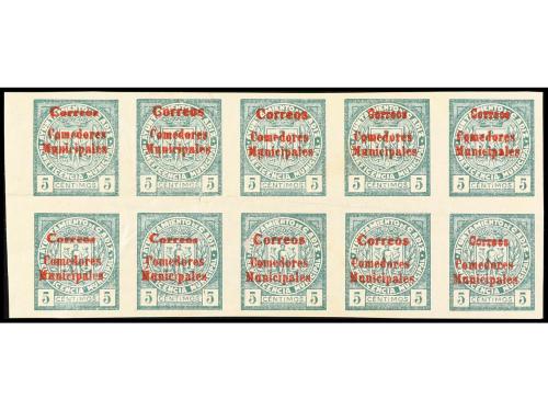 * ESPAÑA GUERRA CIVIL. CÁDIZ. 5 cts. verde, bloque de diez sin dentar, habilitado CORREOS, COMEDORES MUNICIPALES tipo I (3 sellos), tipo II (4 sellos) y tipo III (3 sellos). Algunos pliegues habituales en los escasos ejemplares conocidos. Pieza espectacular y MUY RARA.