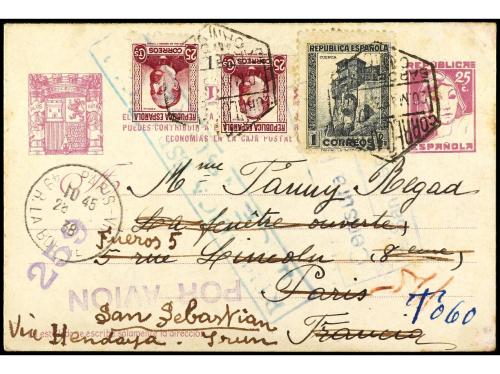 ✉ ESPAÑA GUERRA CIVIL. 1938. BARCELONA a PARÍS y reexpedida a SAN SEBASTIÁN. Entero Postal de 25 cts. lila con franqueo adicional de 25 cts. (2) y 1 pta. Tasada a la llegada con 60 cts. Muy interesante uso entre la zona republicana y la nacional con ambas censuras.