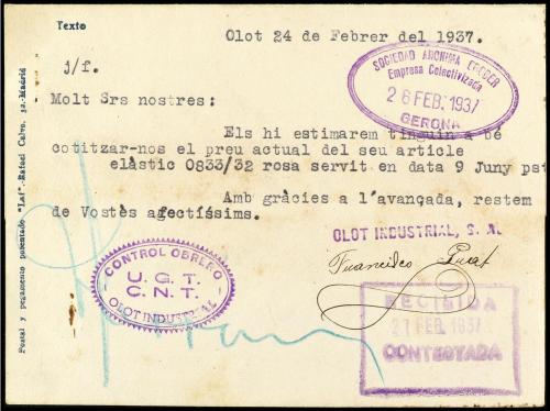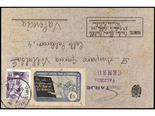✉ ESPAÑA GUERRA CIVIL. 1939 (octubre). Tarjeta Postal a VALENCIA. Marca en violeta CAMPO DE CONCENTRACIÓN/DE PRISIONEROS DE GUERRA/PORTA COELI (VALENCIA)/CENSURA MILITAR. Este campo se inauguró en octubre de 1939 albergando a presos de otros campos, mayoría de Albatera (Alicante). Luego fue prisión y actualmente el hospital Doctor Moliner. MARCA RARÍSIMA.