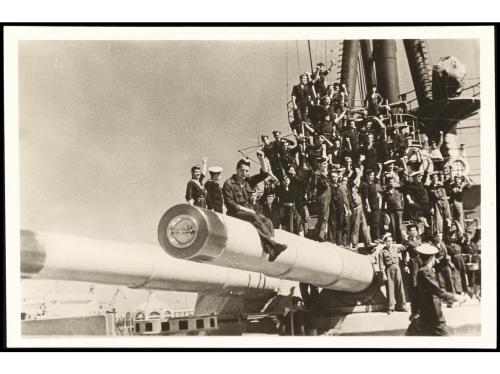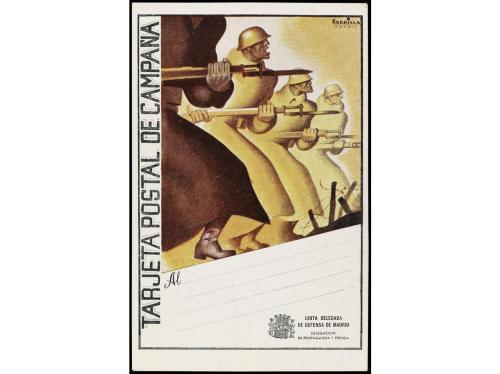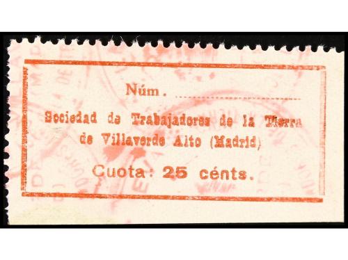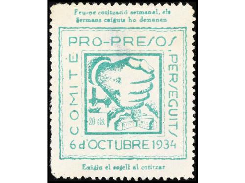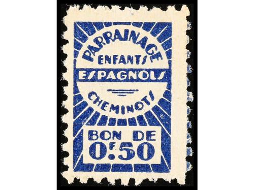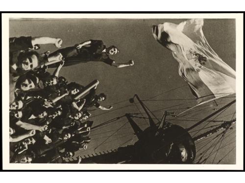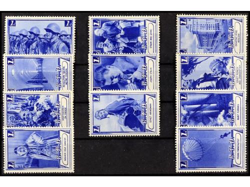 ESPAÑA GUERRA CIVIL. ZONA REPUBLICANA. VIÑETAS POLÍTICAS. Emitidas en Gran Bretaña. SERIE COMPLETA de 24 viñetas de 1 p. azul, emitidas en 1938 por RTD (RUSSIA TODAY), entre las cuales hay la viñeta "spanish youth on red square" (jóvenes españoles desfilando en la Plaza Roja de Moscú, con pancarta de Dolores Ibarruri "La Pasionaria". Allepuz 521 (RRRR). RARÍSIMA y más con la Serie Completa. Algo tonalizado.