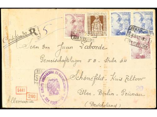 ✉ ESPAÑA GUERRA CIVIL. 1943. ZONA NACIONAL. Sobre de SAN SEBASTIÁN a un PRISIONERO ESPAÑOL en el CAMPAMENTO COMUNITARIO DE SCHÖNEFELD, en Berlín. Los trabajadores forzados realizaban tareas de producción armamentística para el bando alemán. RARO los sobres dirigidos a presos españoles en Alemania.