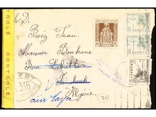 ✉ ESPAÑA GUERRA CIVIL. 1944. Sobre circulado de PALMA de MALLORCA a Juan Roig en AÏN TAYA (Argélia), uno de los pasajeros del buque inglés "STANBROOK" con refugiados republicanos con destino a ORÁN. Censuras en anverso y reverso. Se incluye un segundo sobre (1942) dirigido a TINDOUF, mismo destinatario. Su número de pasajero en el citado barco fue 1366. RARAS.