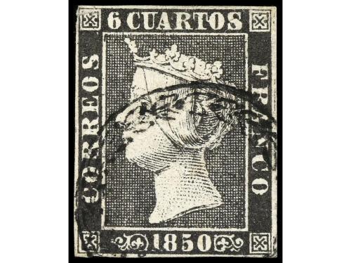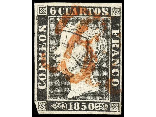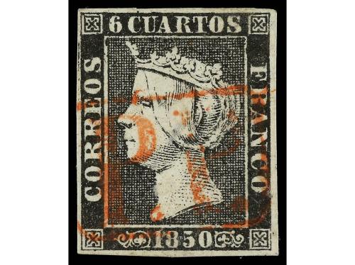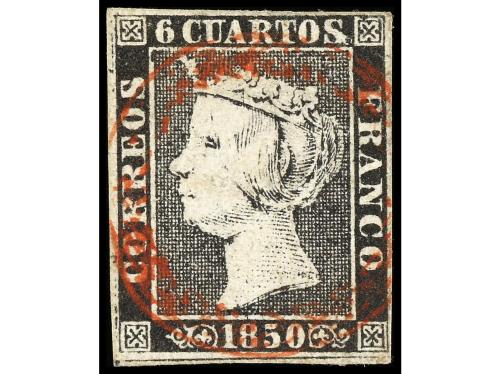° ESPAÑA. Ed. 1. 6 cuartos negro, pl. I tipo 22. Mat. P.P. de CÁDIZ en rojo. Muy bonito y RARO. Cert. GRAUS.