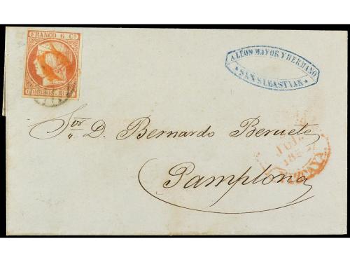 ESPAÑA. Ed. 12. 1852. SAN SEBASTIAN a PAMPLONA. 6 cuartos rosa, mat. parrilla y O en rojo estampado a la llegada. Rara obliteración sobre el sello, no conocemos ningún otro ejemplar. Cert. CEM.