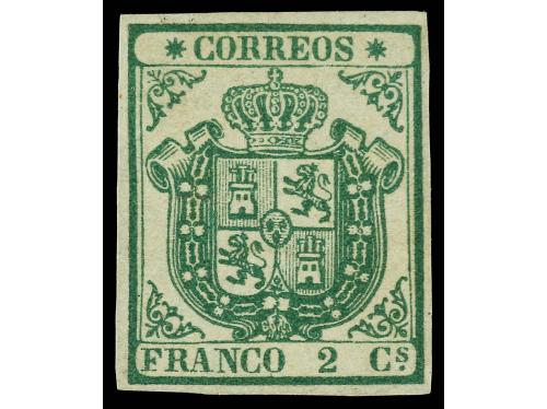 (*) ESPAÑA. Ed. 32A. 2 cuartos verde. PAPEL GRUESO AZULADO. Sello rarísimo en nuevo. PIEZA DE LUJO. Cert. GRAUS. Cat. 17.500€.