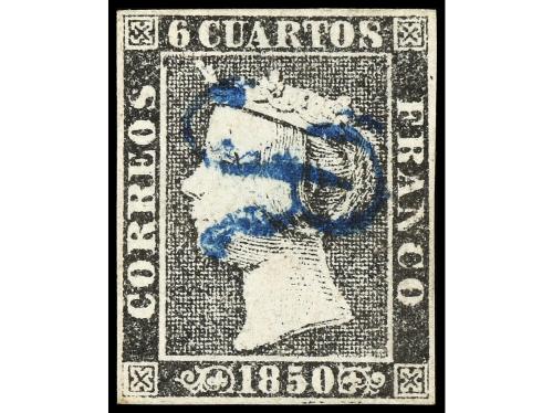 º ESPAÑA. Ed. 1. 6 cuartos negro. Reconstrucción de la plancha I con mat. 11 LIMADO DE SEVILLA en azul. PRECIOSA y RARA de completar.