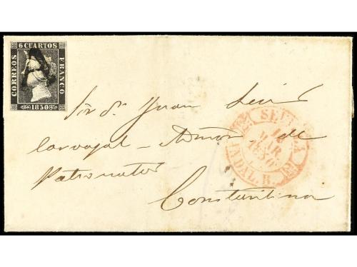ESPAÑA. Ed. 1 A. 1850. Envuelta de SEVILLA a CONSTANTINA. 6 cuartos negro, plancha II, obliterado con la marca prefilatélica A de SEVILLA EN NEGRO. Única pieza conocida sobre carta. Cert. GRAUS.