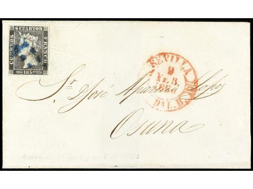 ESPAÑA. Ed. 1. 1850. SEVILLA a OSUNA. 6 cuartos negro, mat. 11 LIMADO DE SEVILLA en azul.