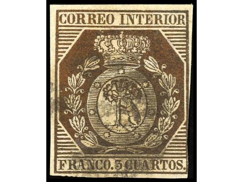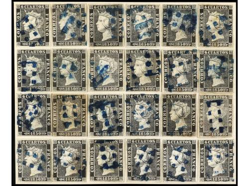 º ESPAÑA. Ed. 1. 6 cuartos negro, pl. I tipo 24, mat. CORONA DE LAUREL de Málaga en rojo. RARÍSIMO, solo cuatro ejemplares conocidos. Cert. GRAUS.