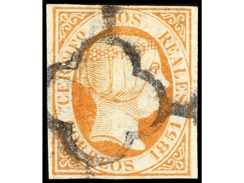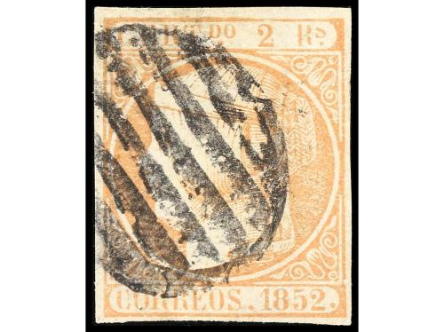 ° ESPAÑA. Ed. 8. 2 reales naranja. Amplios márgenes y fino matasellos. Muy buen ejemplar. Cert. COMEX. Cat. 14.500€.