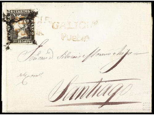 ESPAÑA. Ed. 1A. 1850. PUEBLA a SANTIAGO. 6 cuartos negro, mat. mixto araña y GALICIA/PUEBLA sobre el sello que se repite en la carta.
