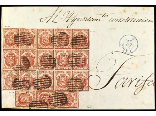 ESPAÑA. Ed. 33 (18). 1854. CÁDIZ a TARIFA. Gran fragmento de Plica Judicial circulada con 18 sellos de 4 cuartos.