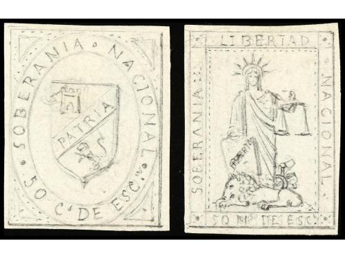 ESPAÑA. 1869. GOBIERNO PROVISIONAL. 2 bocetos no adoptados de 50 mils. realizados a lápiz con leyenda SOBERANÍA NACIONAL y con valor de 50 mils. de Esc. ÚNICOS.