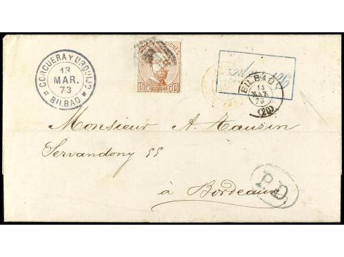 ESPAÑA. Ed. 125. 1873 (13 marzo). BILBAO a BURDEOS. 40 cts. castaño, mat. parrilla y marca en azul POR VAPOR tipo I, tasa de 25 cts. de real aplicada a las cartas salidas por barco durante el SITIO DE BILBAO por los carlistas. Muy rara dirigida al exterior, a Francia se conocen un total de cinco cartas. Sello de 40 cts. desprendido y substituido por otro sello por motivos estéticos.