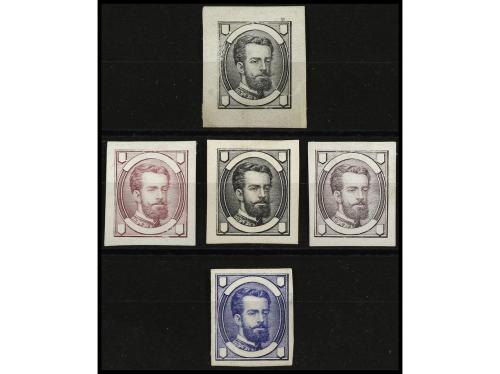 ESPAÑA. 1871. PROYECTO NO ADOPTADO. Cinco PRUEBAS DE PUNZÓN (Gálvez 640/42, 646, 649).