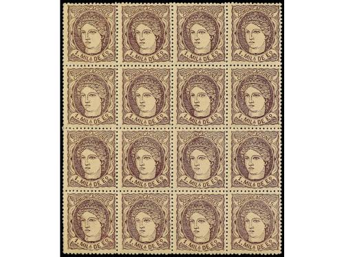 ** ESPAÑA. Ed. 102c (16). 1 mils. castaño s. anteado. Bloque de 16 sellos en nuevo, rara tonalidad de color, excelente centraje. LUJO.