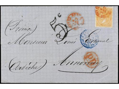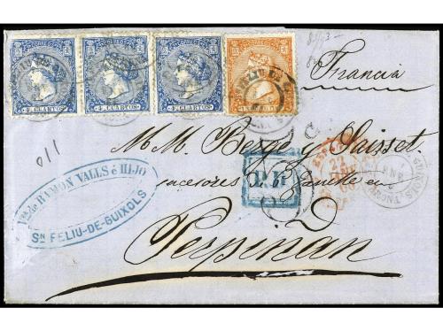 ESPAÑA. Ed. 81 (3), 82. 1866. SAN FELIU DE GUÍXOLS a FRANCIA. 4 cuartos azul (3) y 12 cuartos naranja. Preciosa combinación de franqueo.