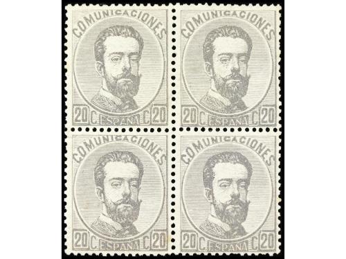 * ESPAÑA. Ed. 123 (4). 20 cts. gris. Bloque de cuatro. Excelente centraje. MAGNÍFICO. Cat. 775€.
