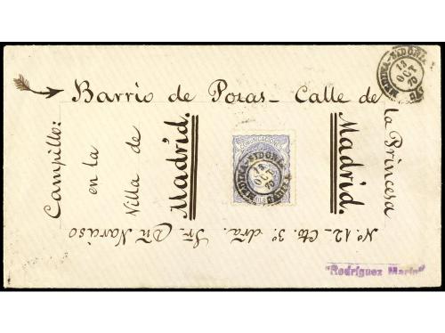 ° ESPAÑA. Ed. 122F. 12 cuartos lila FALSO POSTAL, mat. rombo de puntos y fechador de Madrid.